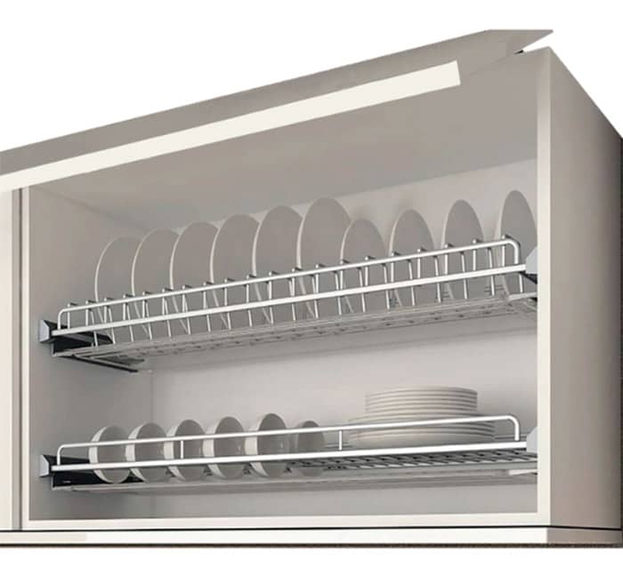 Giá nâng hạ thông minh (thường ở tủ trên): Rất tiện lợi, đặc biệt cho người già, trẻ em hoặc người có chiều cao khiêm tốn. Có thể kéo hạ nhẹ nhàng xuống tầm với để úp/lấy bát đĩa mà không cần với cao.